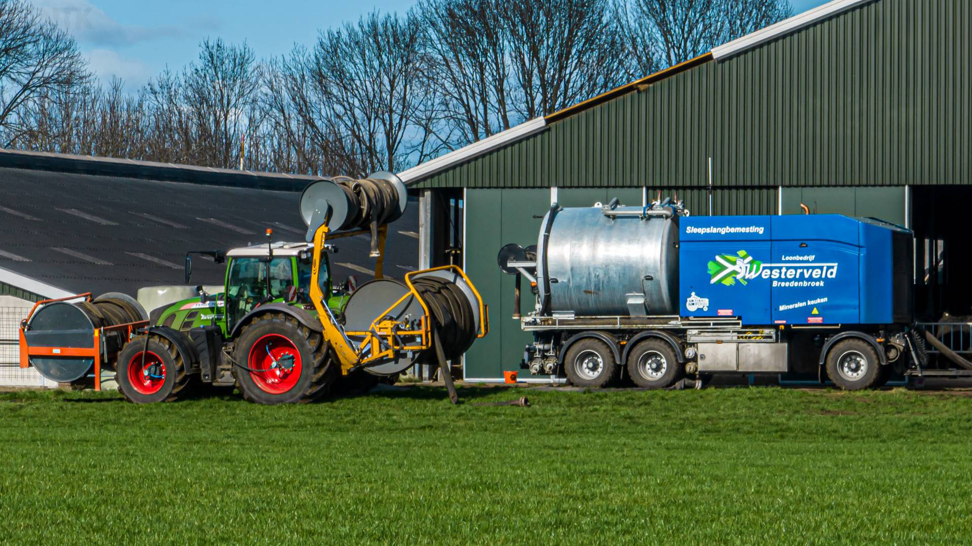 De sleepslangcombinatie die wij inzetten heeft luchtdrukwissen en staat op brede banden. De bemester is voorzien van sectie-afsluiting en de tractor van GPS waardoor zeer nauwkeurig bemest kan worden met minimale overlap. Met in totaal 1600 meter slang kan een grote afstand overbrugd worden. De “Swing-over”-arm zorgt voor veel flexibiliteit van de bemester en maakt het ook mogelijk dat in hoeken bemest kan worden. Voorop de tractor zit een fronthaspel die tevens dient als buffertank voor op de kopakkers.